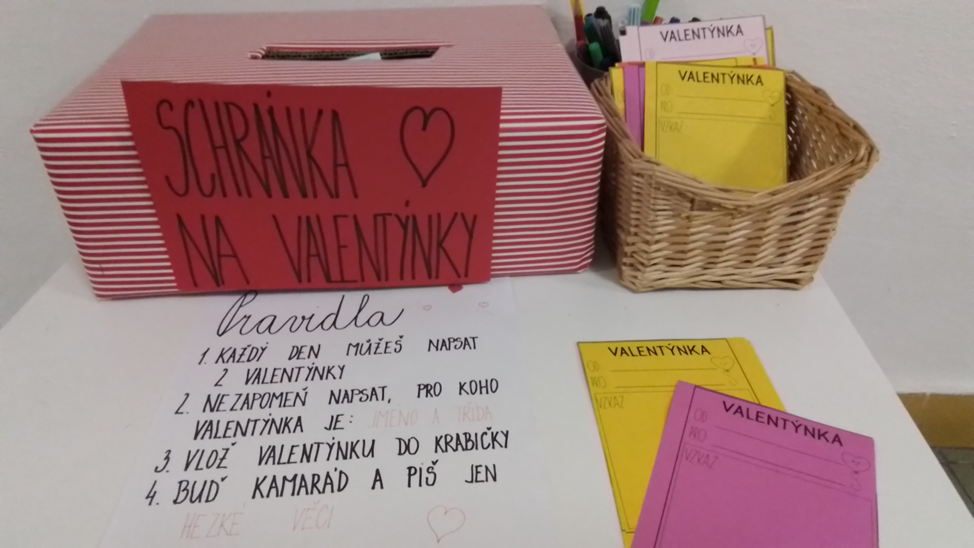 Během valentýnského týdne mají žáci 1. stupně možnost potěšit své kamarády a učitele milým vzkazem. Po celý týden mohou vhazovat své valentýnky do připravené schránky, která byla umístěna na stolečku vedle třídy 2.A.