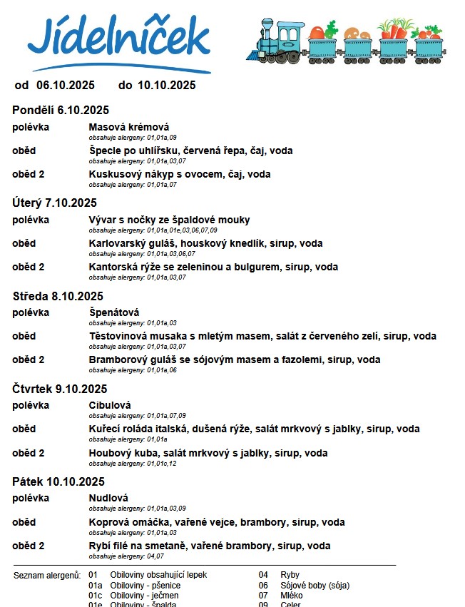 Od 13.12.2014 jsou stravovací zařízení povinna poskytovat informace o alergenech v potravinách dle nařízení EU č.1169/2011 o poskytování informací o potravinách spotřebitelům. Potravinová alergie je nepřiměřená reakce imunitního systému na určitou potravinu nebo její složku. Vě školním jídelníčku se tedy nyní budeme setkávat s údaji o alergenech, budou uvedeny v závorce za názvem jídla např: (obsahuje al. : 03, 09). Přehled alergenů najdete na následujícím obrázku.