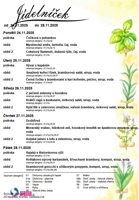 Od 13.12.2014 jsou stravovací zařízení povinna poskytovat informace o alergenech v potravinách dle nařízení EU č.1169/2011 o poskytování informací o potravinách spotřebitelům. Potravinová alergie je nepřiměřená reakce imunitního systému na určitou potravinu nebo její složku. Vě školním jídelníčku se tedy nyní budeme setkávat s údaji o alergenech, budou uvedeny v závorce za názvem jídla např: (obsahuje al. : 03, 09). Přehled alergenů najdete na následujícím obrázku.