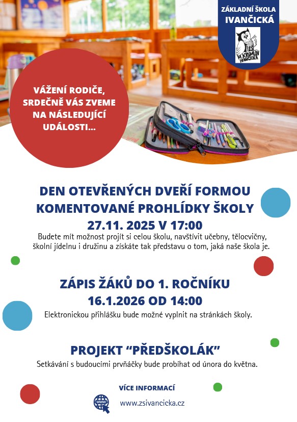 Srdečně zveme děti a rodiče budoucích prvňáčků a žáků přípravné třídy na komentovanou prohlídku školy, která se bude konat 27.11.2025 v 17 hodin. Sraz účastníků před školou.