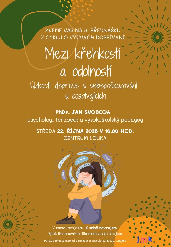 Přednáška má název: MEZI KŘEHKOSTÍ A ODOLNOSTÍa bude se věnovat tématům jako jsou úzkosti, deprese a sebepoškozování u dospívajících.a bude se věnovat tématům jako jsou úzkosti, deprese a sebepoškozování u dospívajících.